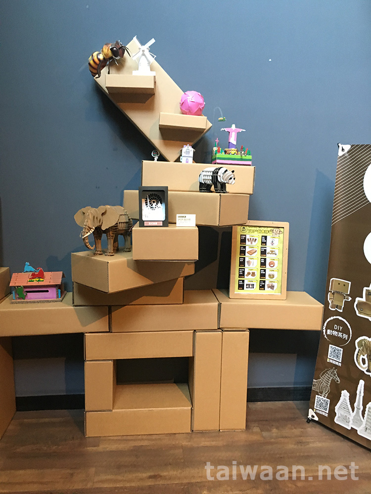 ダンボールだけで棚が出来上がり、そこに陳列される紙だけで制作された動物や装飾品の数々。