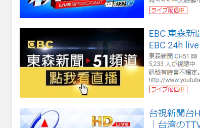 TVにクロームキャストを繋いでスマートフォンのYouTubeアプリで「taiwan news live」検索すると、いくつか台湾のライブ放送がヒットします。オススメは「EBC 東森新聞」とか「CTI中天新聞」です。