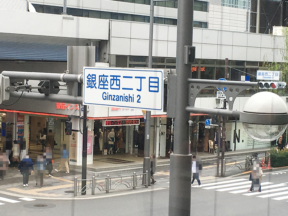 銀座西二丁目(Ginzanishi 2)の標識が目の前に。